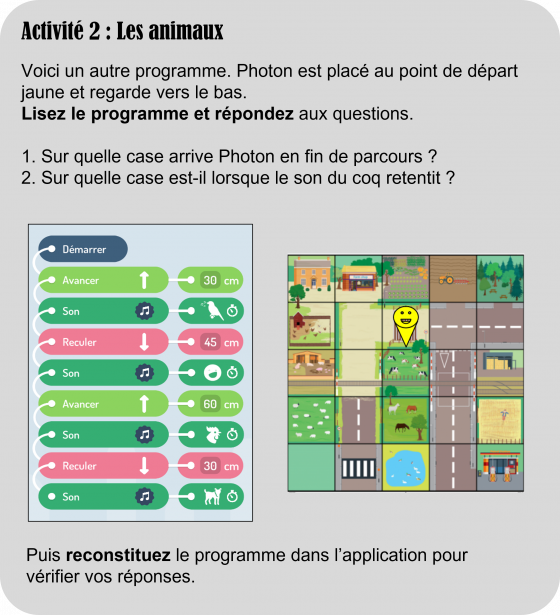 Après une première séance permettant de découvrir les robots du kit, les élèves travaillent sur le premier pilier du Savoir-Coder : « décoder un programme ». Lors des ateliers de cette séance, les élèves doivent lire un programme donné et prédire le comportement du robot. Puis, ils reconstituent le programme dans l’application et vérifient que le robot agit selon leurs prédictions.