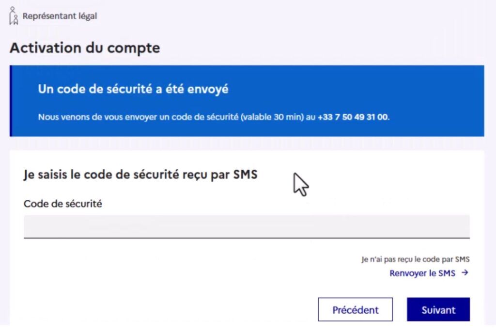 3 – Saisissez le code d’activation reçu par SMS (valable 30 minutes) dans le champ prévu à cet effet et cliquez sur le bouton Suivant.